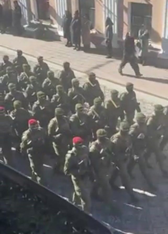 large group of soldiers marching in formation on a cobblestone street. The soldiers are wearing camouflage uniforms, and some have red berets. They are carrying rifles and appear to be participating in a military parade or exercise. A few pedestrians are visible on the sidewalks, watching the soldiers march. The buildings lining the street are light-colored with classic architectural details. The video is taken from an elevated position, possibly from a window or balcony.