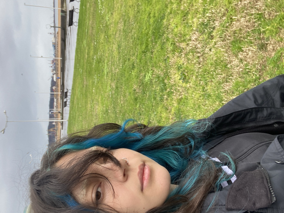 - "A close-up, high-angle selfie-style photograph depicts a young individual in the left foreground, featuring dark brown, wavy hair with prominent bright blue and turquoise streaks" by FM-whkRu1, licensed under CC BY 4.0