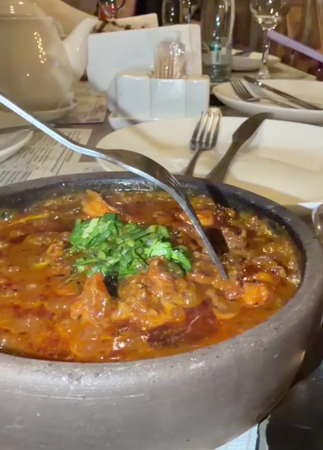 A close-up shot shows a fork lifting a portion of stew from a grey, earthenware bowl. The stew is rich and orange, topped with fresh green herbs. The bowl sits on a table with white plates, cutlery, water bottles, and a teapot, suggesting a restaurant setting. A person sits at the table in the background.