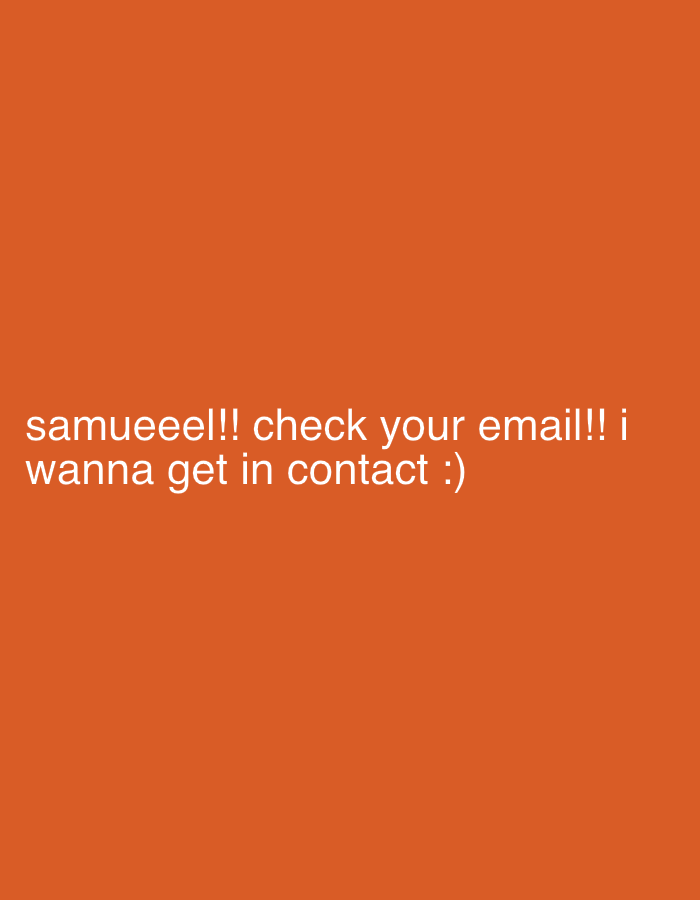 The scene is a digital graphic with a uniform, solid orange background. White sans-serif text is present in the lower portion of the frame, spanning two lines. The first line reads: "samueeel!! check your email!! i". The second line reads: "wanna get in contact :)". The text is the primary subject, conveying an explicit request for contact to an individual named Samueeel. No people, physical objects, or environmental elements are depicted within the image. The entire scene is confined to this graphical display, located in the city of Tetela Del Monte, Mexico.