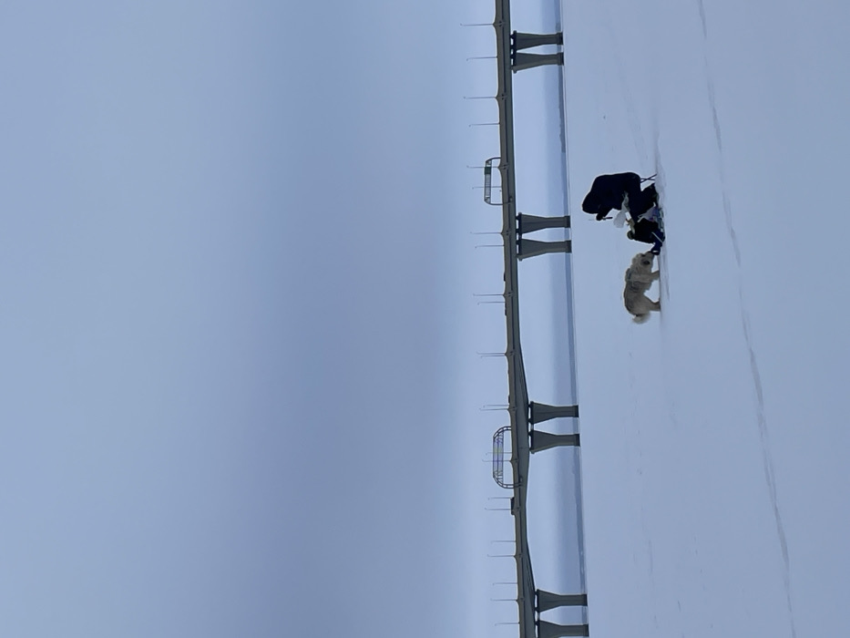 The image displays a wide, frozen expanse, identified as the Neva Bay in Saint Petersburg, Russia, under an overcast, light grey sky. In the foreground, a single individual, dressed in dark winter clothing including a hooded jacket, is seated on a small, dark stool or chair directly on the ice. Their hands are positioned downward, engaged in an activity at ice level. Adjacent to the person, a light-colored, medium-to-large dog stands, observing the person's actions with its head lowered towards their hands. In the mid-ground, spanning horizontally across the scene, is a multi-lane concrete bridge, identifiable as a section of the Western High-Speed Diameter (ZSD). The bridge is supported by numerous distinctive 'Y'-shaped concrete piers, and its deck features evenly spaced streetlights and an overhead sign gantry. The ground is uniformly covered in white snow or ice, with faint tracks visible near the foreground subjects.