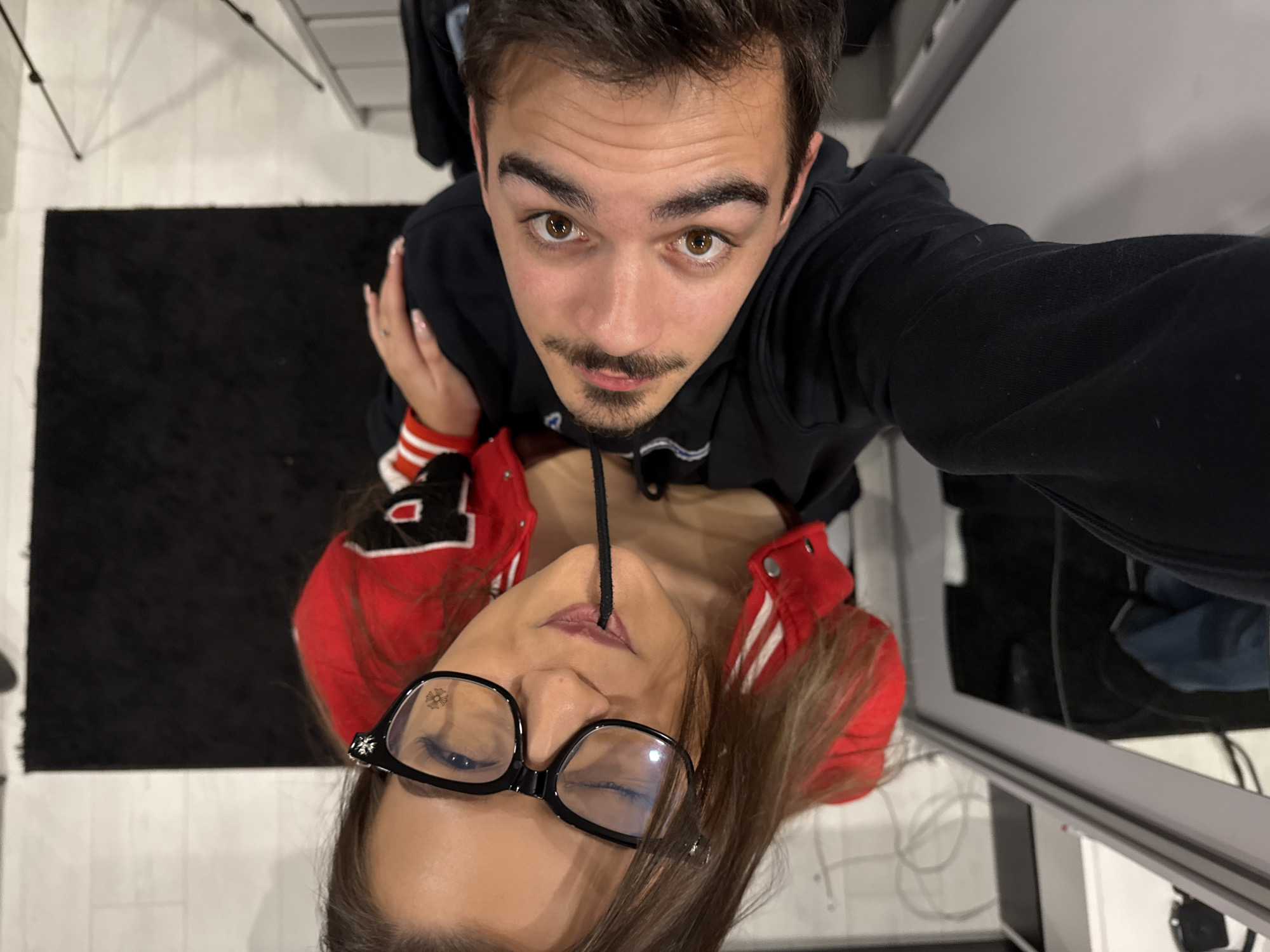 A man and a woman are in close proximity, captured in a high-angle perspective selfie. The man is wearing a black hoodie. The woman is wearing glasses and a red and white varsity jacket and appears beneath the man, with a drawstring of the man's hoodie positioned between her lips. The background includes a black rug, a light-colored cabinet, and what appears to be a photography light stand. There are no indications of the city of Sofia, Bulgaria, or any other location.