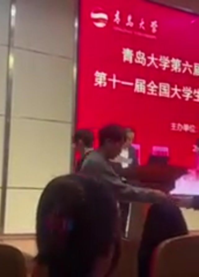 Here is a detailed description of the video: **Scene:** The video appears to be filmed in a university lecture hall or auditorium