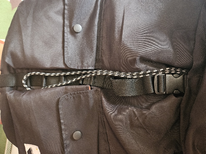 The scene is located in Muka, Indonesia. The image presents a close-up, top-down view of a black textile item, likely a garment or accessory, constructed from a synthetic fabric displaying a subtle sheen and various folds. No individuals are visible. A black webbing strap, approximately 2.5 cm in width, runs vertically down the center. A black and white speckled cord, roughly 5 mm in diameter, is threaded through two loops integrated into the black webbing strap, forming a distinct U-shaped loop near the upper portion of the frame. Attached to the lower section of the central webbing strap is a black plastic side-release buckle, depicted in an unclasped state. Two circular, matte black snap buttons, each approximately 1.5 cm in diameter, are positioned on either side of the central strap, set into distinct fabric sections that suggest pocket flaps or similar closures. A small, rectangular white label with a partially obscured black logo or text is affixed to the upper left corner of the black fabric. The immediate background is indistinct, showing faint patterns and color variations, consistent with an indoor environment.