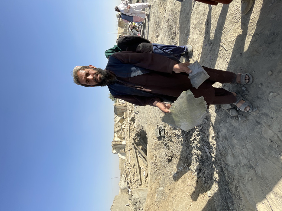 The image captures a man standing in a scene of extensive structural damage in Spin Boldak, Afghanistan, under a clear blue sky. The central figure, a man with a beard, wears a brown long-sleeved garment, a dark vest, and a light-colored cap, along with sandals. He holds two irregular fragments of debris: a larger, light grey-green piece in his left hand and a smaller, dark grey piece in his right. He faces the camera with a somber expression. In the mid-ground to the right, several other individuals are visible. One person is partially obscured by a dark green head covering. Further right, a group of men in traditional attire stands amidst the rubble. The background reveals a landscape of collapsed and severely damaged buildings, characterized by piles of bricks, concrete, and various structural wreckage. The ground is dusty, uneven, and covered with debris. Shadows suggest bright, direct sunlight. A utility pole is visible in the distant right background.