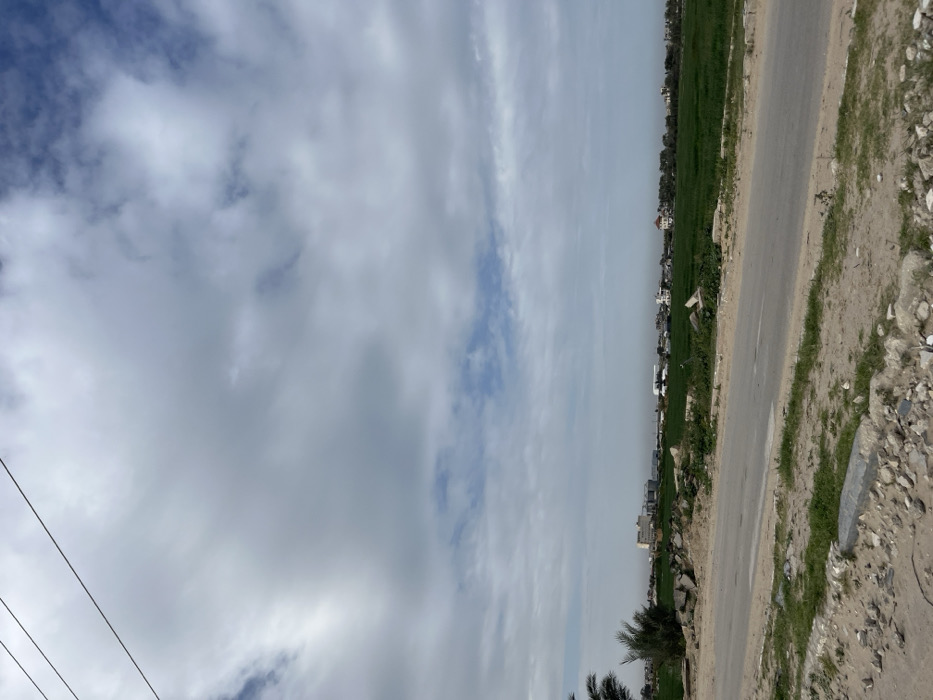 An outdoor landscape image captures a wide-angle view of an open area in the city of Unknown, Palestinian Territory, under an overcast sky. The sky, occupying the upper two-thirds of the frame, features extensive grey and white stratocumulus clouds, with intermittent patches of visible blue sky, particularly in the upper right quadrant. Three thin, dark linear objects, consistent with overhead power lines or cables, traverse the upper left corner diagonally downwards. The foreground is dominated by a two-lane asphalt road, appearing in fair condition, running horizontally across the lower third of the image from left to right. The road surface is clear of vehicles or pedestrians. Adjacent to both sides of the road are unpaved shoulders composed of light-colored soil, sand, and various sizes of rubble, including broken concrete fragments and stones. Sparse green vegetation, resembling grass, grows in patches on these shoulders, particularly between the road and the rubble piles. Beyond the road and shoulders, the midground and background consist primarily of expansive green fields, likely cultivated, extending towards a distant horizon. Scattered within these fields, especially on the left side, are irregular piles of light-colored debris, consistent with construction or demolition rubble. On the far left, partially obscured by the frame edge, are the fronds of a palm tree or similar large plant. The distant horizon reveals a low-density urban or suburban development. Several buildings are visible; to the left-center, a multi-story building with a light-colored façade and multiple windows is prominent. To the right, residential-style structures with light walls and at least one with a reddish-brown, possibly domed, roof are discernible. A faint, hazy line beyond the buildings suggests a distant body of water, likely the sea. No individuals, animals, or active vehicles are present in the scene.