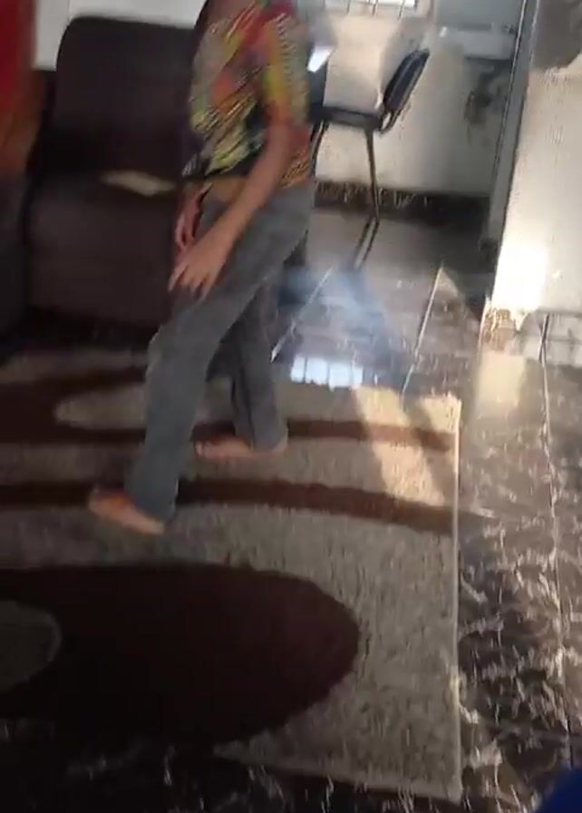 A young girl wearing a colorful, patterned shirt and gray jeans dances barefoot in a home. The floor is covered in patterned tiles and a shaggy rug. An adult, also wearing a similar colorful shirt and gray jeans, is dancing in the background. The camera moves around erratically during the brief clip, focusing first on the floor then panning to show the girl’s face. A kitchen can be seen through an opening in the background.