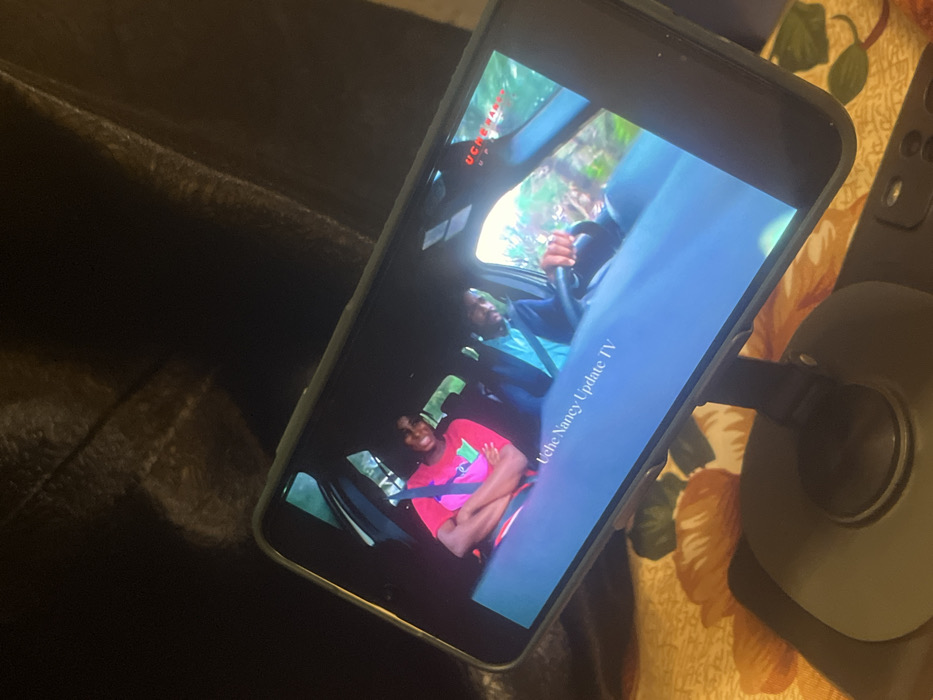 A phone screen displays a video featuring two men in a car. One man is driving, wearing a blue suit, while the other is in the passenger seat wearing a pink shirt with crossed arms. "Uche Nancy Update TV" is subtly visible on the screen's lower right corner. The phone is resting on a holder, sitting on a patterned surface. A dark, textured object is in the background, partially obscuring the view.