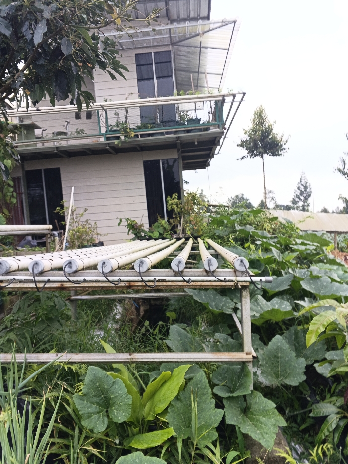 The scene depicts an outdoor agricultural area in Clacuc, Timor-Leste, with a two-story building in the background. The building features light-colored horizontal siding, dark-tinted windows, and an upper-level balcony with a metal railing. A translucent, corrugated roof structure extends over the balcony, where several potted plants are visible. In the foreground, a metal frame supports multiple white PVC pipes arranged horizontally. Some pipes exhibit regularly spaced holes, indicative of a hydroponic system, while others are tapered at their ends and appear capped with dark gray stoppers, from which dark wires extend. Dense green vegetation, including large-leafed plants, small shrubs, and grass, covers the ground around and beneath the pipe structure. A tree with dark foliage partially obscures the upper-left portion of the building. The sky is overcast, and a tall, slender tree with foliage at its apex stands in the distance to the right of the building, with hints of other structures or vegetation beyond. No people are visible.