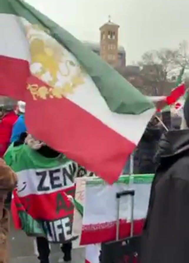 small crowd of people gathered outside, holding and waving flags with green, white, and red horizontal stripes. Some of the flags feature a lion and sun emblem in the center. A person in the foreground wears a garment decorated to resemble the Iranian flag, with the text "ZENDEGI AZADI WOMEN LIFE". People are chanting in unison, although their words are slightly unclear. The weather appears overcast, and a church-like building is visible in the background. Some individuals carry signs and umbrellas, indicating it may be raining. Overall, the scene appears to depict a protest or demonstration with Iranian themes.