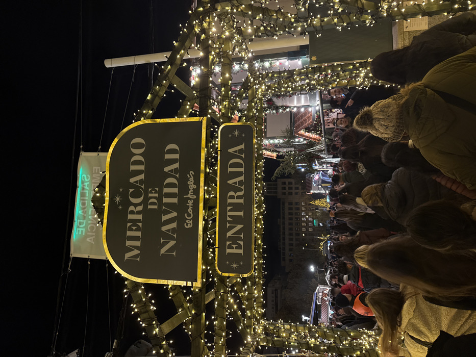 A bustling Christmas market scene is captured at night, adorned with strings of small, warm lights. A prominent sign reads "MERCADO DE NAVIDAD" and "ENTRADA," marking the entrance. Crowds of people are gathered, mostly with their backs facing the camera. Behind them, market stalls and decorations are visible, creating a festive atmosphere. In the distance, city buildings add context to the location. The lighting and composition highlight the lively ambiance of the event.