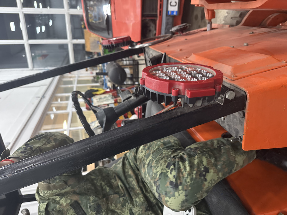 An individual wearing a green and brown camouflage uniform is seated inside an orange utility vehicle or small tractor, positioned within an indoor workshop. The person's left arm is visible, with the hand resting on a black roll bar or frame. A black steering wheel is present to the right of the individual. Mounted on the right side of the orange vehicle's frame are two circular LED work lights with red housings, featuring multiple distinct LED emitters. In the mid-background, a red car, likely an older model, is partially visible, displaying a Bulgarian license plate with "C" (Sofia region identifier) and subsequent characters. The background environment consists of a workshop space with large windows featuring white frames, revealing interior lighting fixtures and indistinct workshop equipment. The scene suggests vehicle maintenance or preparation in a garage located in Sofia, Bulgaria.