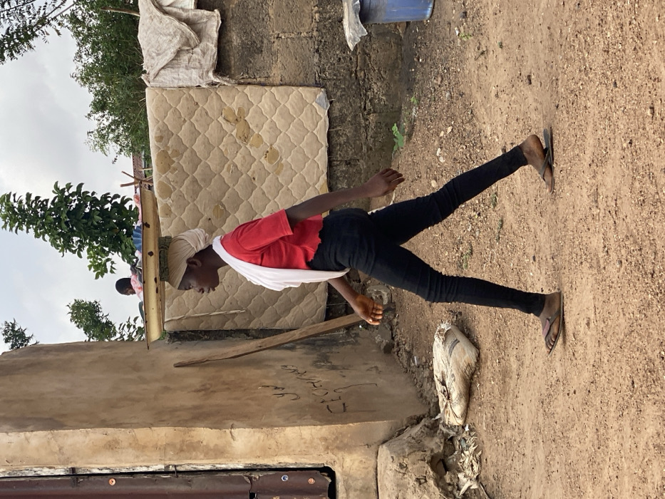 The scene depicts an unpaved outdoor area in Idiroko, Nigeria, under an overcast sky. In the foreground, a young woman, appearing to be of African descent, walks from left to right in profile. She wears a red short-sleeved shirt with a ruffled hem, black skinny jeans, and brown leather flip-flops. A light-colored cloth is wrapped around her head, and she balances a light-colored, possibly metal, shallow basin or tray containing indistinct items on her head. Her arms swing naturally with her stride. To the left, a weathered, light brown building wall with visible text or graffiti leans against a corrugated metal panel. A wooden plank stands vertically against this wall. Near the base of the wall, a white sack and debris are visible on the dirt ground. In the background to the right, a large, worn, quilted mattress is propped or hung against a dark, possibly block, wall. An additional piece of fabric is draped over the top right corner of the mattress. Behind these structures, dense green foliage and trees are visible. A small child's head is partially visible above a distant structure, to the left of the prominent tree. On the far right, a blue plastic bucket rests on the ground. The ground throughout the image is composed of reddish-brown dirt or sand.