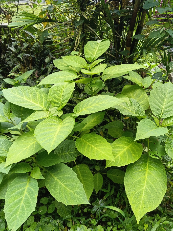 Lush, green foliage dominates the scene. A robust plant with vibrant, ovate leaves occupies the central focus. The leaves exhibit prominent venation patterns and varying shades of green, suggesting different ages or light exposure. Background textures include glimpses of other plants and greenery, creating a dense and vibrant natural environment. The overall impression is one of rich, healthy plant growth.