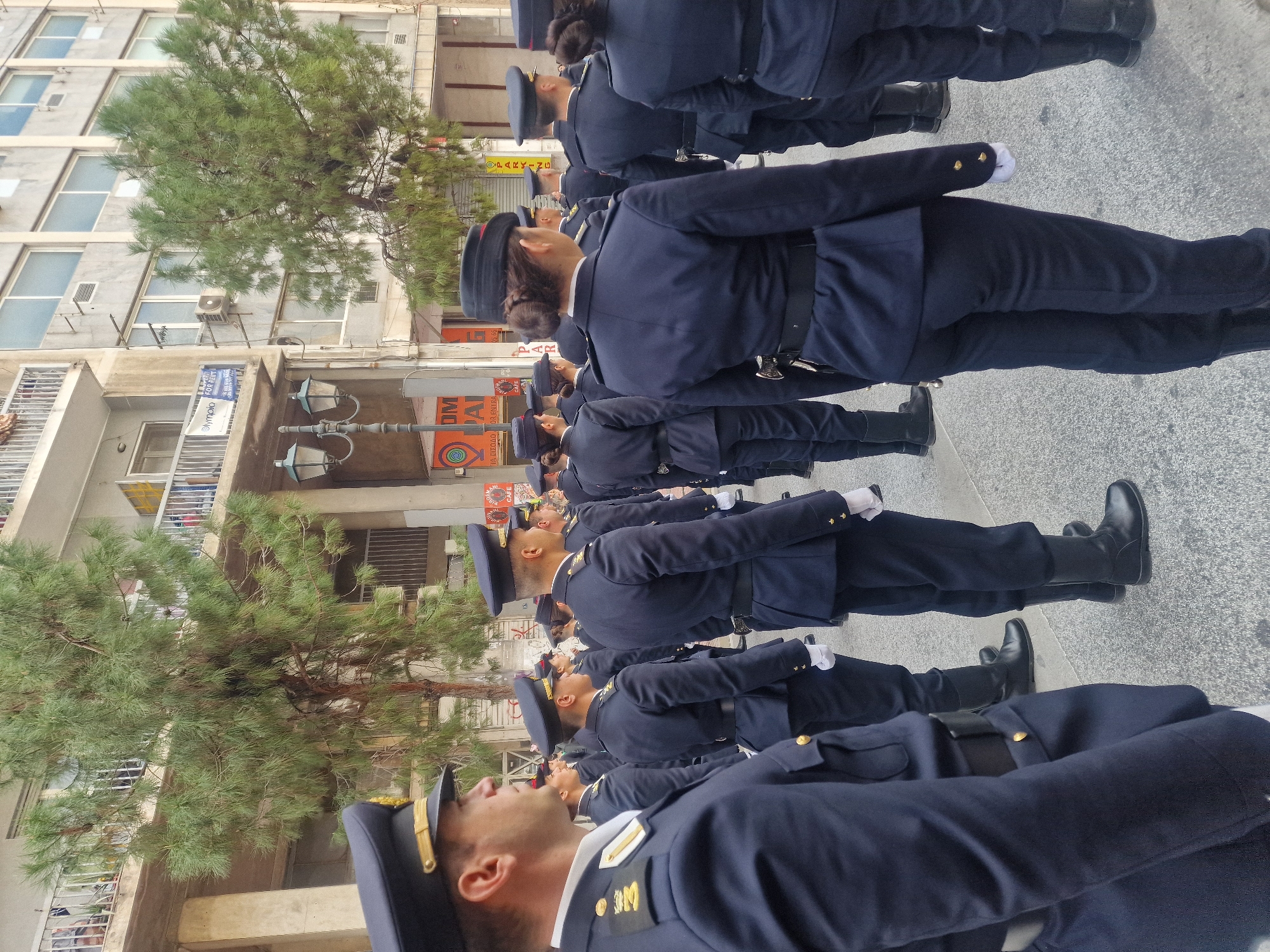 The image displays a formation of approximately 20 uniformed individuals standing on a paved street in Athens, Greece, near a "DM Parking" facility on Diligianni Street