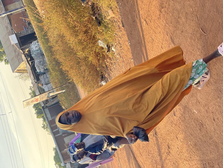 A wide-angle, eye-level shot captures a street scene in Muchiya, Nigeria, at what appears to be late afternoon or early morning due to the warm, golden light. The primary subject is an individual, likely female, facing slightly to the right of the camera, wearing a mustard-yellow full-length abaya or similar garment that covers most of their body and head, revealing only part of their face. Their expression is neutral. They wear light-colored sandals and floral-patterned trousers are visible underneath the abaya. In their right hand, they hold a small, black plastic bag. Behind this individual, a line of several people extends towards the left, partially obscured. The person immediately behind the primary subject is a male wearing a dark jacket over a lighter shirt and a blue baseball cap. Another male is visible further back, wearing a white kufi. The line of people appears to be either standing or moving slowly along the dirt road. The ground is a reddish-brown dirt or gravel road, with visible tire tracks or footpaths. To the right, the road's edge transitions into an area of dry, yellowish-green bushy vegetation. Scattered pieces of refuse, including plastic bottles and bags, are visible among the plants. In the background, on the far side of the road, several low-rise structures with corrugated metal roofs and walls are present, suggesting simple buildings or perhaps a workshop/storage area. Piles of what appear to be stacked materials or refuse are visible near these structures. A tall, thin signpost with visible text is located near the buildings on the right side. The sky is clear and bright, consistent with the warm lighting conditions.