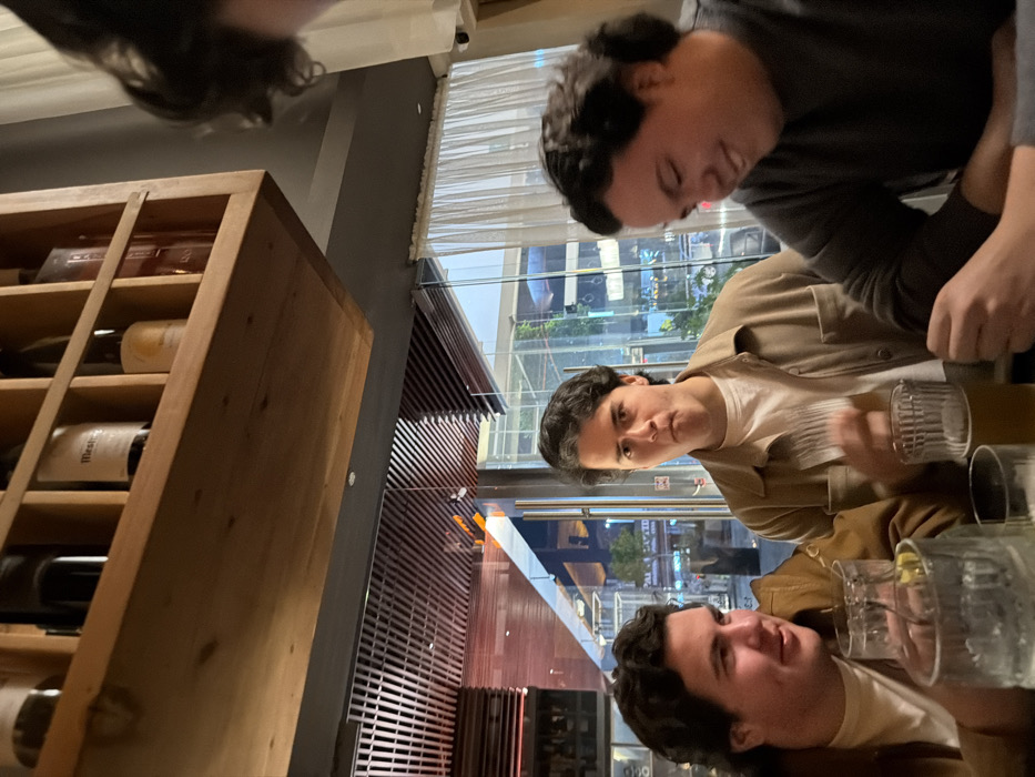 Three men are sitting at a table in a restaurant, drinking from glasses. One man wears a tan jacket, another a dark gray shirt, and the third, whose face is partially cut off, a brown jacket. A wooden wine rack with bottles sits to the left. Outside the window behind them, there is a building with orange lights. The photo is taken at an angle, making it appear tilted.