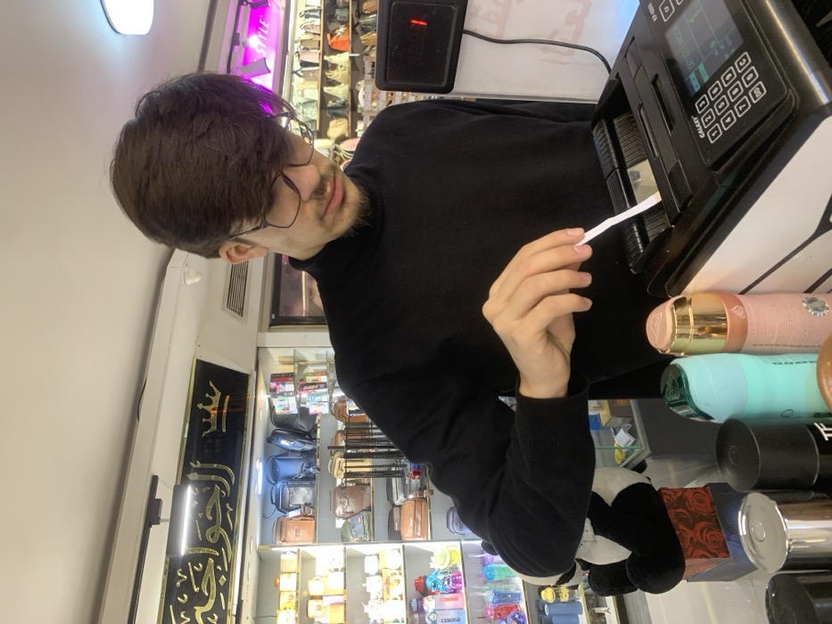 A man with dark hair and glasses wearing a black turtleneck stands near a counter. He holds a thin white paper strip in his hand, seemingly evaluating a scent. The counter holds a cash register-like machine and several perfume bottles in varying colors and shapes. Behind the man, shelves display an assortment of handbags and small trinkets, typical of a retail setting. The overall scene suggests a moment of fragrance testing within a shop.