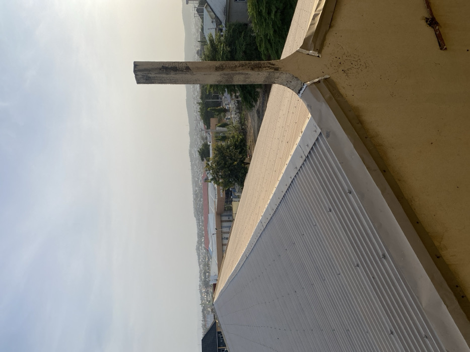 From a rooftop, a partially obstructed view captures a hazy cityscape. A tall, aged, light-colored concrete or metal structure rises from the roof's edge. Adjacent to the structure, a light gray, corrugated metal roof stretches diagonally across the lower half of the frame. The building's exterior walls are visible, painted in a faded yellow or beige. Trees and buildings in the distance are obscured by the haze, under a light sky.