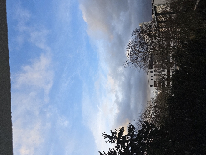 A daytime outdoor scene features a partly cloudy blue sky. A tall building is visible amidst trees and bushes, suggesting an urban or suburban setting. The image is slightly rotated, with the sky dominating the left side and greenery on the right. A small portion of a grey structure is visible on the left edge, possibly part of a building or wall.