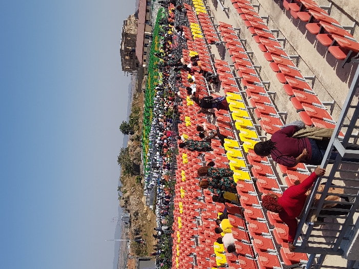 An outdoor scene in the city of DU, Nigeria, depicts a large gathering within an amphitheater or stadium setting under a clear blue sky. In the foreground, two adult females stand leaning against a metal railing, observing the scene. One wears a red top and light-colored pants, the other a dark purple top and dark pants, with a light brown jacket over her arm. Both have dark braided hair. The midground features extensive tiered seating predominantly composed of red individual chairs, interspersed with several rows of yellow chairs, creating a striped pattern. Numerous individuals are scattered throughout these seats, some seated, others standing or moving. In the background, below the tiered seating, a large crowd of people is densely gathered on a flat open area. Many individuals in the crowd wear white attire, while others appear in green, suggesting a coordinated event or attire. Beyond the crowd, the landscape includes natural rocky outcrops, sparse vegetation, and distant hills. Several structures are visible: a tall mast or pole on the left, a building with a red-tiled roof, and a multi-story structure with exposed framework or scaffolding on its upper levels. A body of water or a large reflective surface is also present to the left of the main crowd area.
