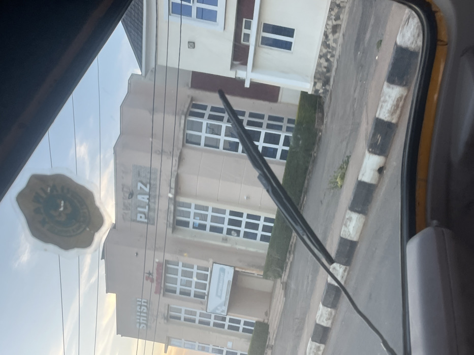 This image depicts a daytime street scene in Gura Top, Nigeria, viewed from inside a vehicle. The foreground is occupied by a dark dashboard and a black windshield wiper angled diagonally upwards to the right. A prominent circular brown and green sticker, possibly a NAFOWA (Nigerian Air Force Officers' Wives Association) emblem, is affixed to the upper-center of the windshield. Across a paved street, a two-story commercial building with a light beige facade dominates the left-center of the frame. Its upper section displays "SHISH" on the left and "PLAZ" (likely part of "PLAZA") on the right. Below "SHISH," a red logo, possibly for a bank, is visible. The building features numerous large, white-framed, grid-patterned windows. A wide, white, rectangular sign with illegible text is mounted above the main ground-floor entrance. The building's front is bordered by manicured green hedges. To the right of the primary building, a lighter-colored building with a dark red/maroon section on its upper floor is partially visible, also featuring windows with blue tints. The street is bordered by a black and white striped curb. Overhead, multiple thin utility lines crisscross against a light blue, hazy sky. No people or vehicles other than the perspective vehicle are visible.