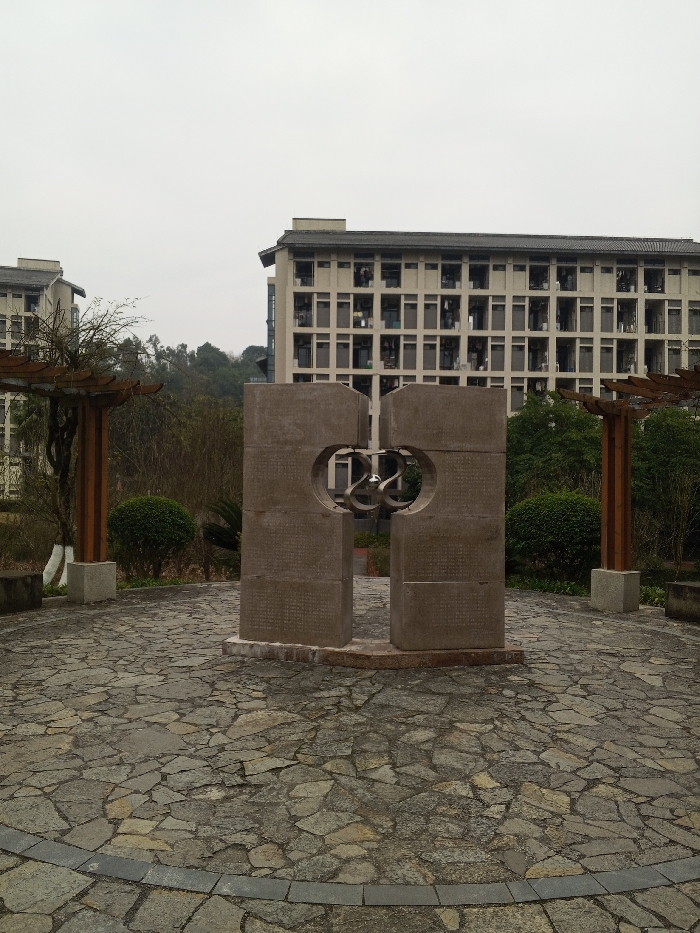 A stone monument with circular cutouts depicting yin and yang stands on a paved, flagstone plaza. The monument's surface is inscribed with text. In the background, a large, multi-story building features many windows. Two wooden structures with posts frame the monument. Trees and greenery surround the plaza. The sky is overcast and gray.