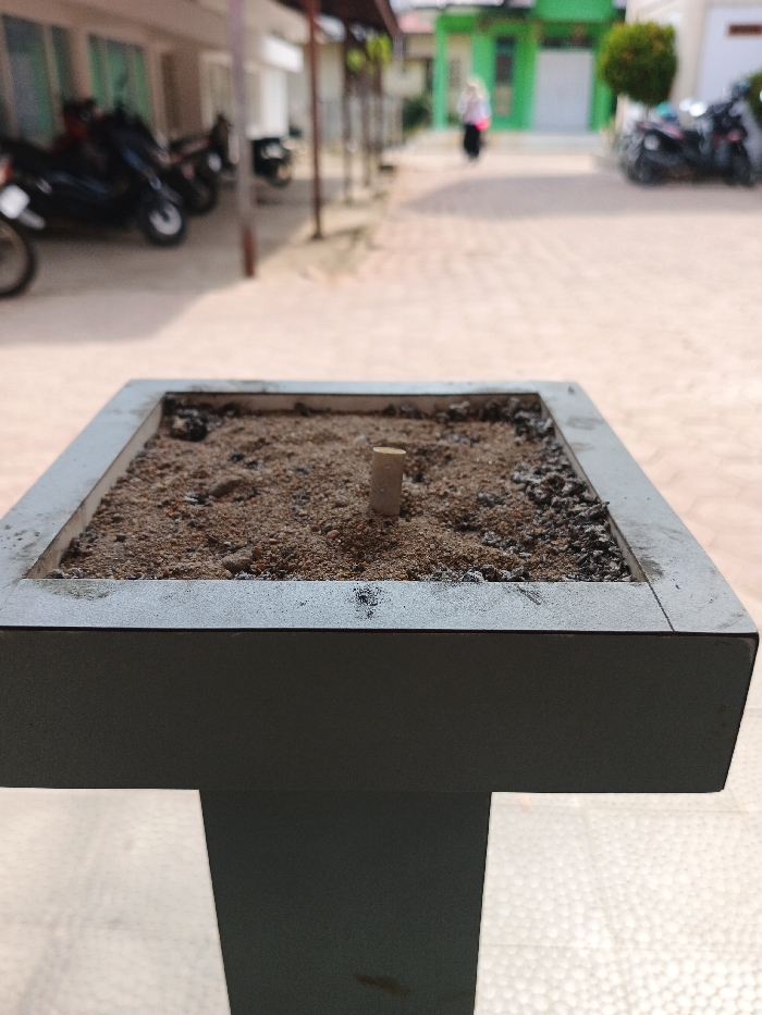 - "A square, gray ashtray sits prominently in the foreground, filled with sand and a single cigarette butt" by FM-DDjgL2, licensed under CC BY 4.0