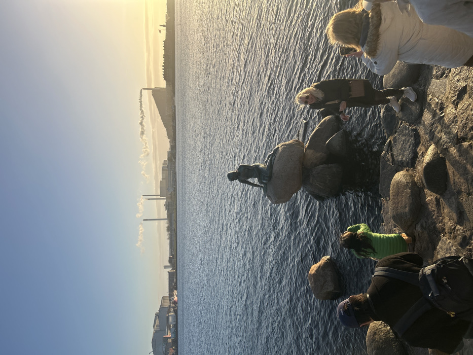 An outdoor, daytime image depicts the Little Mermaid statue on the Langelinie promenade in Copenhagen, Denmark, under a clear sky with low sun