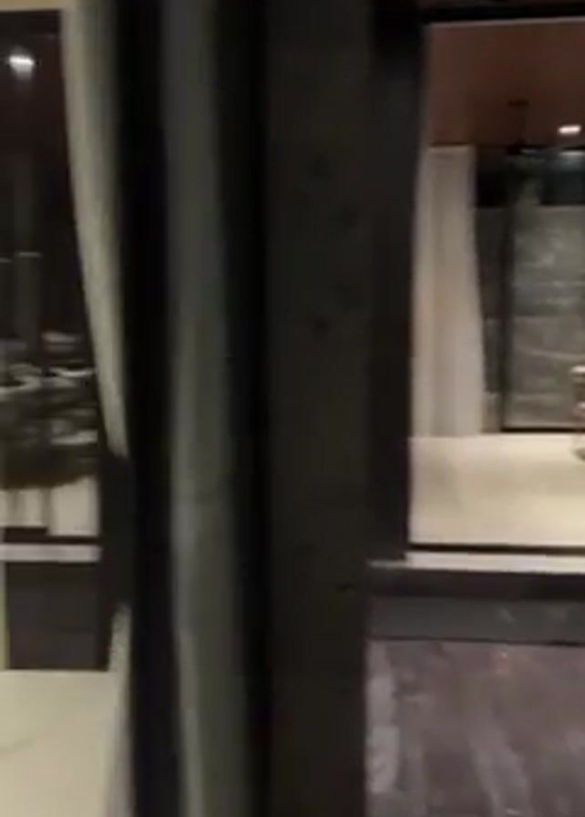 The video begins with a view from a wooden deck looking through large glass doors into a dining area with a large white table and seating
