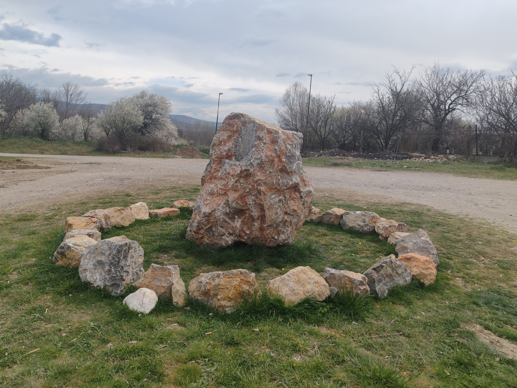 The scene is located in Blajievo, Bulgaria. A prominent, large, irregularly shaped boulder, exhibiting a mottled reddish-brown and gray coloration, occupies the central foreground, resting on a manicured patch of green grass. This central boulder is surrounded by an incomplete circular arrangement of approximately 15-20 smaller, similarly textured rocks. A dirt or gravel path curves around the grassy area. The background features a blend of deciduous trees; some on the left are in full white blossom, indicative of spring, while others further right are mostly bare. Two slender black streetlights stand vertically amongst these trees. Distant hills are visible under a cloudy, overcast sky. No individuals or active subjects are present within the frame.
