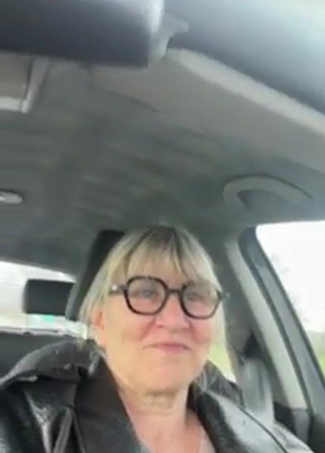 A woman with blond bangs and round, black-rimmed glasses is sitting in the driver's seat of a car. She is wearing a black leather jacket over a light-colored sweater. The car is moving, as indicated by the blurred scenery visible through the windows. The interior of the car is gray, and the woman is looking directly at the camera with a slight smile.