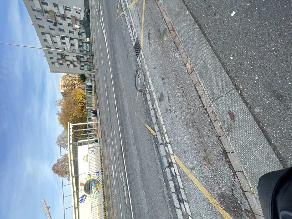 The image depicts an urban street scene in Schiltigheim, France, under a clear blue sky with scattered white clouds. The foreground shows an asphalt road surface with white solid and broken lane markings, alongside yellow diagonal lines indicating a designated zone. A circular manhole cover and a rectangular storm drain grate are visible within the road. The road surface exhibits wear and minor debris. A cobblestone curb separates the roadway from a textured gray sidewalk, upon which small pieces of refuse are scattered. A black object, consistent with a bag, is partially visible in the bottom-left corner. In the mid-ground, a dark metal fence runs parallel to the road. Behind the fence, on the left, a white building with a curved roof and a large circular window is adorned with colorful handprint and abstract designs. Text on the building's facade partially reads "ESPACE ADAPT." A segment of an orange construction crane is visible above and to the left of this building. Several trees with yellow and orange autumn foliage are situated behind the fence and building. To the right, a multi-story light gray residential building features numerous balconies with dark railings. A tall, slender utility pole extends vertically from the roadside on the right. A dark-colored vehicle is parked on the street adjacent to the residential building. No individuals are depicted in the scene.