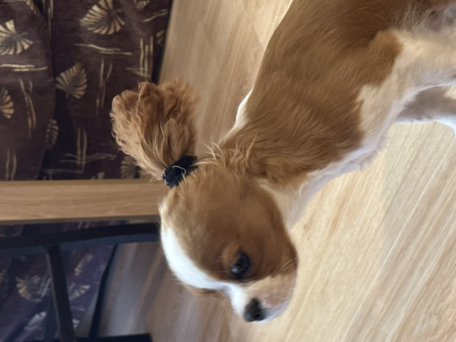 An indoor photograph captures a Cavalier King Charles Spaniel-type dog in a profile view, oriented to the left