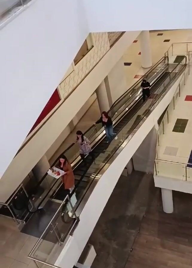 shot from above of a department store interior, where people are traveling upwards on two parallel escalators. On the left escalator, there are three women. The first woman in a brown jacket carries a tray of small food items, the second woman has patterned shirt, and the third woman wears jeans. On the right escalator, there is a single individual wearing a black shirt and a cap. The architecture of the building includes white walls, tiled floors, and visible steel supports.