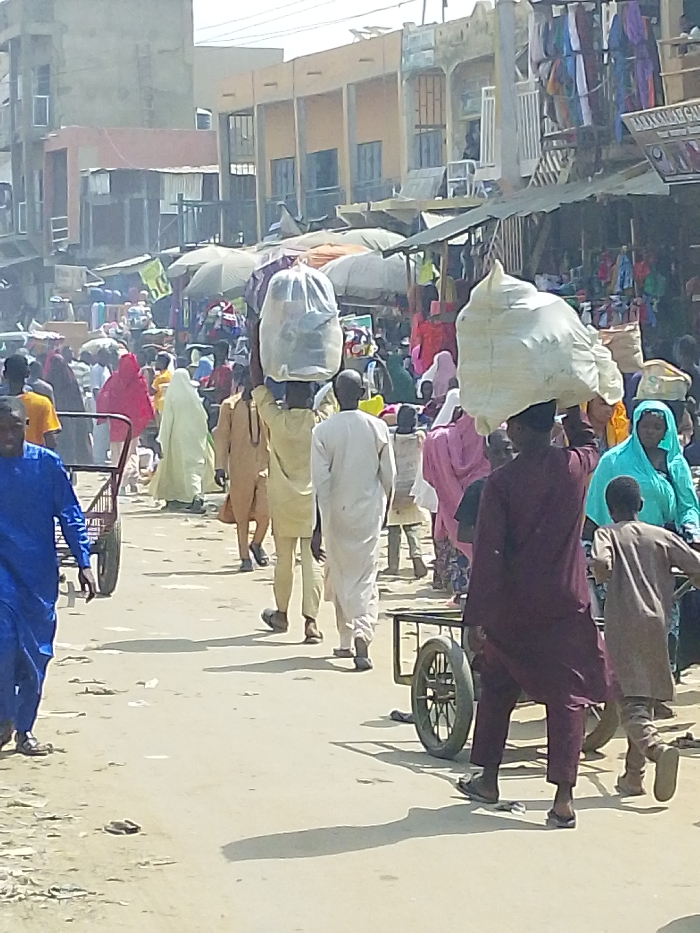 This image depicts a bustling outdoor market street in Fagge D1, Nigeria, under bright daylight conditions
