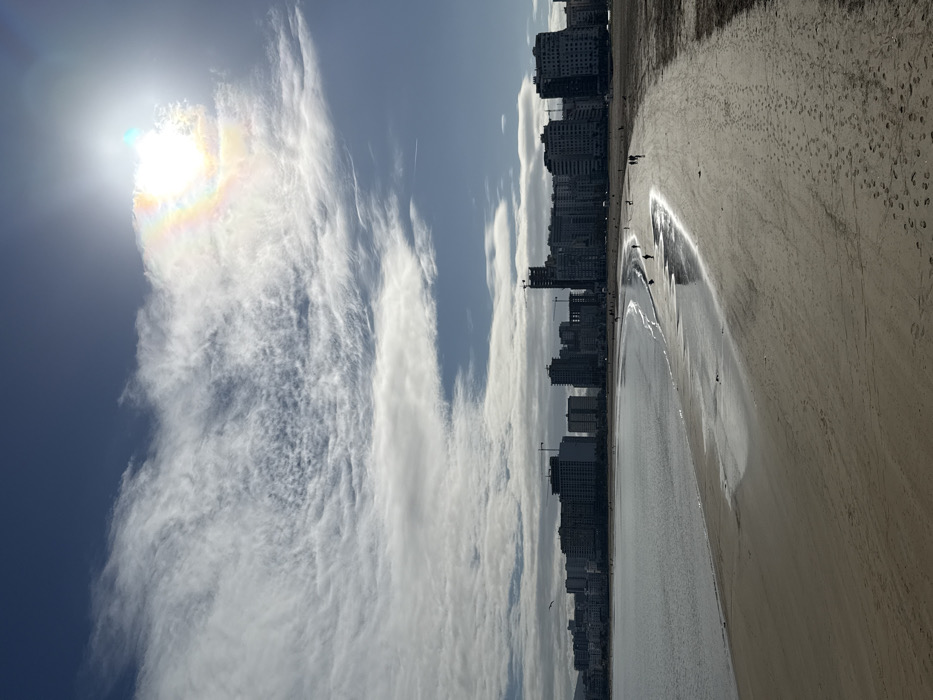The image displays a wide panoramic view of the beach and urban coastline in Tangier, Morocco, under a partly cloudy sky. The foreground features a broad, light-colored sandy beach, which curves gently from the left towards the right. Numerous footprints are visible on the sand, with large areas closer to the waterline appearing wet and reflective, indicating recent tidal activity. The tranquil waters of the bay occupy the midground, reflecting the overhead sky. Along the far side of the bay, a dense city skyline is visible, composed of numerous multi-story buildings, including residential and commercial high-rises. Several structures within the skyline are under active construction, identifiable by visible cranes and incomplete upper floors. Distant mountainous terrain is discernible behind the city on the far left. Approximately 10 to 15 individuals are dispersed across the sandy beach, predominantly walking near the water's edge. One individual in the mid-center appears to be bending or interacting with an object on the sand. A single bird is in flight over the water on the left side of the frame. The sun, positioned in the upper right quadrant, is partially obscured by wispy clouds, producing a distinct lens flare with prismatic light effects.