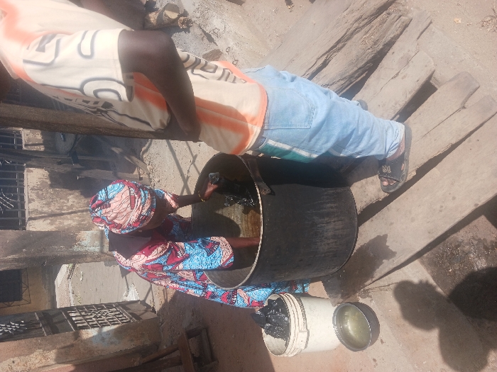 This image depicts an outdoor scene in Okene, Nigeria, featuring two individuals involved in a processing activity