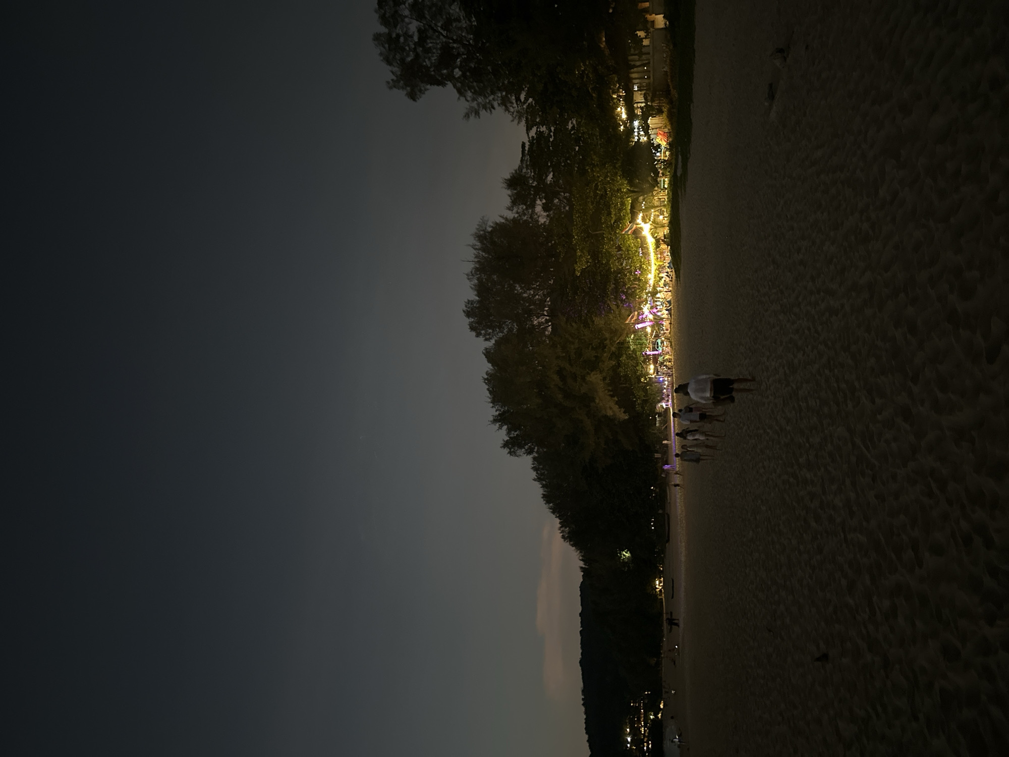 The photograph shows a dimly lit beach at night in Sakhu, Thailand. The sand occupies the lower right portion of the frame. A row of trees runs along the shoreline, illuminated by a series of bright lights, likely from establishments or decorations. Several people are walking along the beach. The sky is dark and predominantly fills the left side of the image. In the far distance, faint city lights are visible.