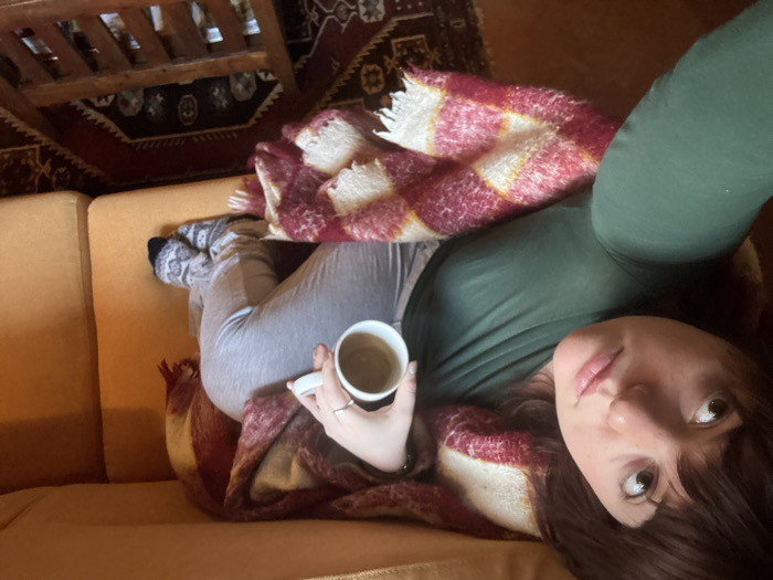 A woman in a green long-sleeved shirt and gray sweatpants lies on a tan couch, covered with a red and cream plaid blanket. She holds a white mug with coffee in her right hand. Her brown hair is parted to the side, and she gazes upward with a slight smile. Above her, a dark rug and a wooden table with ornate legs are visible. The overall ambiance is cozy and relaxed.