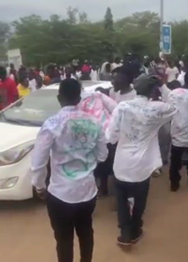 crowd of people surrounding a white car. Many of the people in the foreground are wearing white shirts with writing or drawings on them. They appear to be celebrating, possibly graduation. They are close to the car, and there is some interaction with the vehicle. The scene is outdoors, with trees visible in the background. The day appears overcast.