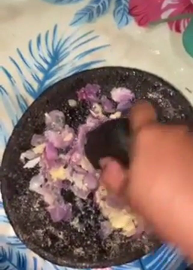 A person is using a stone mortar and pestle to grind up chopped onions and garlic. The person is wearing a brightly patterned shirt and the mortar is placed on a blue floral patterned surface. A voice says "Masak", which is Malay for "cook". The camera moves around showing a kitchen area.