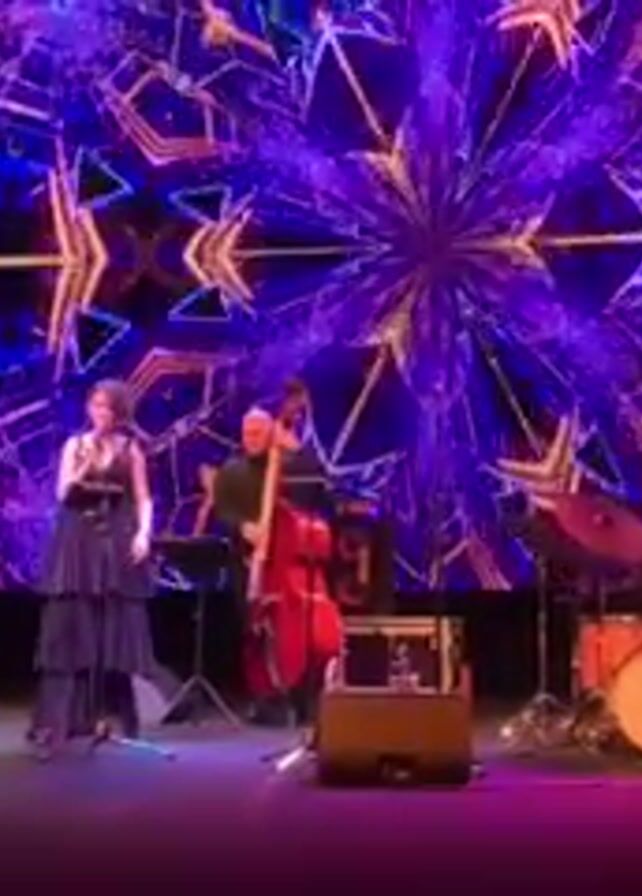 On a stage, a jazz band is performing. The band consists of a female singer in a dark dress, a keyboard player, a bassist, and a drummer. The keyboard player is sitting, while the others are standing. The stage is bathed in a purple light. Behind the band, a large screen displays a swirling, kaleidoscope-like image in shades of purple, blue, and gold. The stage is otherwise dark, with speakers placed on either side of the band.