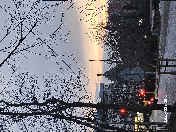 The image displays an urban street scene at dusk during late autumn or winter on Oborishte Street, Sofia, Bulgaria, near its intersection with Shipka Street, with a general westward view. The sky transitions from a light grey-blue at the zenith to a horizon painted with subtle orange, yellow, and pink gradients. In the left foreground, several dark, bare deciduous trees with complex branching patterns stand silhouetted, partially obscuring a modern multi-story building featuring numerous windows and balconies. The ground floor of this building exhibits artificial yellow illumination from a commercial establishment. A cobblestone street occupies the central and right foreground, extending into the midground. Multiple active red traffic lights are visible on the left side of the street, indicating a stop. A dark-colored vehicle, possibly a sedan, is halted on the street, oriented away from the viewer, with its red taillights illuminated. To the right of the street, a park-like area with additional bare trees, shrubs, and a glowing street lamp in the midground is observed. A low, grey stone or concrete wall or barrier runs along the far right edge of the foreground. Centrally located in the foreground, a metal pole supports two unidentifiable, overlapping grey road signs: one triangular and one circular. In the background on the right, traditional residential buildings with sloped roofs are partially visible beyond the park's vegetation. No individuals are discernible within the frame.