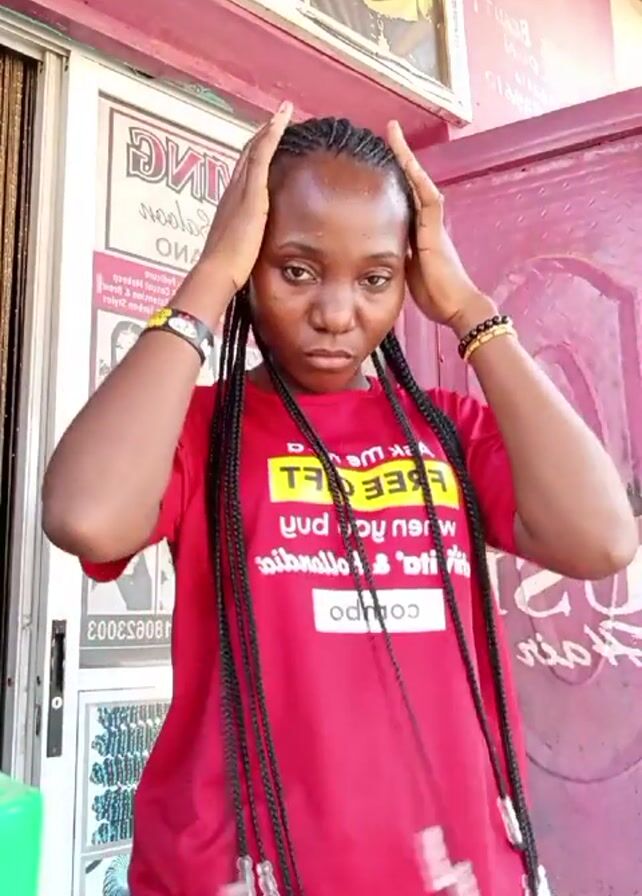 A young woman with dark skin and braided hair stands in front of a beauty salon, wearing a red t-shirt with white text, black pants, and a wrist bracelet on each wrist. She raises and lowers her hands above her head, then makes a gesture with both hands as if rejecting something, then smiles slightly while looking at the camera. The salon has a glass sliding door and a pink door next to it, both with signs. A small green container is partially visible to the left of the woman.
