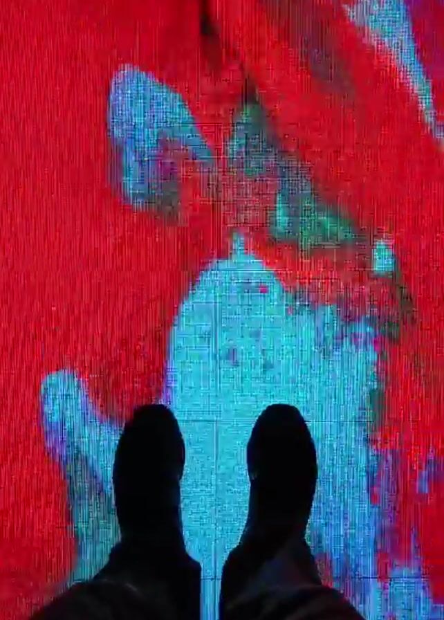 Two legs are visible in the lower half of the frame. They are silhouetted in black. Above them, a large digital screen displays rapidly changing colors and abstract patterns. The colors shift from red to pink to blue to turquoise. The patterns are indistinct. The video has a grainy, pixelated quality. There is indistinct speech audible in the background.