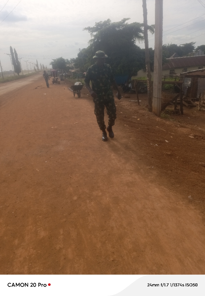 The image displays an unpaved, reddish-brown dirt road in Makurdi, Nigeria, under a bright, overcast sky. A male individual, attired in a military-style camouflage uniform consisting of a boonie hat, long-sleeved shirt, trousers, and dark boots, walks towards the viewer on the right side of the road. In the mid-ground on the left, several other individuals are visible, some pushing or standing near wheelbarrows, one containing light-colored material. A series of utility poles extends along the left side of the road into the distance. On the right side of the road, a concrete utility pole stands in the foreground. Behind it are rudimentary structures, including a corrugated metal shed, and a larger building with a dark roof. Dense green vegetation and trees are present in the background.