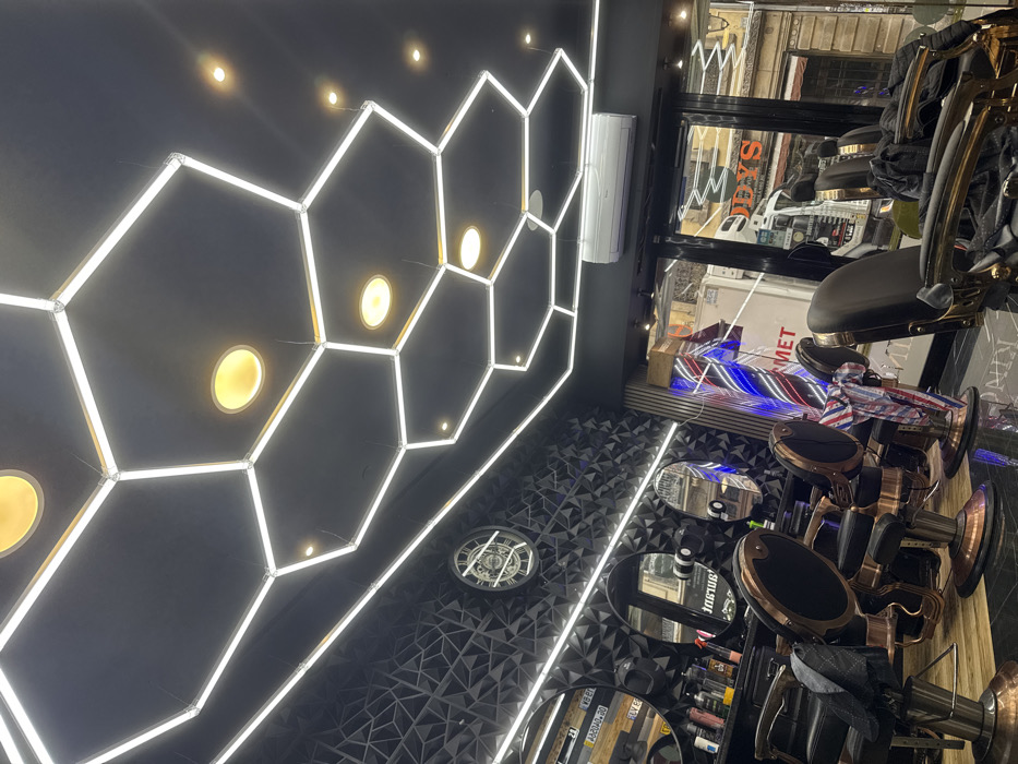 This image depicts the interior of a modern barbershop named "ODYS MARTINEZ COIFFEUR," located at 4 Rue des Tonneliers, 67000 Strasbourg, France. The perspective is an upward-angled view, showcasing the shop's contemporary design. The ceiling is dark, featuring an elaborate, interconnected network of white hexagonal LED light tubes that form a geometric pattern, complemented by several circular, warm-toned recessed spotlights. A white wall-mounted air conditioning unit is visible near the front of the shop. A prominent black wall is adorned with a three-dimensional geometric textured pattern. Three large, circular mirrors are mounted on this wall, reflecting the opposite interior and the street outside, which shows older European buildings, other shopfronts, and a white van. A circular metallic object, possibly decorative wall art resembling a gear or clock, is positioned high on the textured wall. In the foreground and midground, a row of ornate barber chairs stands on a dark wooden floor. These chairs are upholstered in dark material with distinctive bronze/copper-toned and gold-toned metallic frames and hydraulic bases. A plaid towel is draped over the armrest of one chair, while a black garment rests on another. Dark counters displaying various hair care products are positioned in front of the mirrors. Near the glass storefront, an illuminated traditional red, white, and blue striped barbershop pole is visible, signifying the establishment. No people are present within the scene.