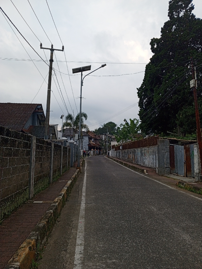 This image depicts a residential street in Chennai, India, viewed from a slightly elevated perspective. The paved road, dark gray in color, features a faded white solid line delineating the left edge of the traffic lane and curves gently uphill into the distance. The sky above is uniformly overcast, indicating diffused light conditions. On the left side of the road, an elevated sidewalk paved with reddish-brown bricks runs alongside a gray concrete block wall, which shows signs of moss and discoloration. Behind this wall, several houses with dark tiled roofs and light gray or white walls are visible, along with palm trees. Two prominent utility poles stand on this side: a wooden or concrete pole with multiple cross arms supporting numerous overhead electrical wires, and a taller metal pole equipped with a solar panel array powering a street light fixture that extends over the roadway. An antenna is attached lower on the solar street light pole. On the right side of the road, a less defined, narrower shoulder runs adjacent to a varied property boundary constructed from corrugated metal sheets, some rusted, and sections of concrete or masonry. Beyond this barrier, dense green foliage and several trees are prominent, including a large, dark green conifer-like tree that dominates the upper right quadrant. A utility pole with a white box attached is partially visible behind this large tree. Four human figures are visible in the distance, walking away from the viewer. Three figures are grouped on the left side of the road, and one individual is further down on the right side. Their actions are limited to pedestrian movement along the street. No vehicles are present. The overall scene suggests a quiet, potentially residential thoroughfare.