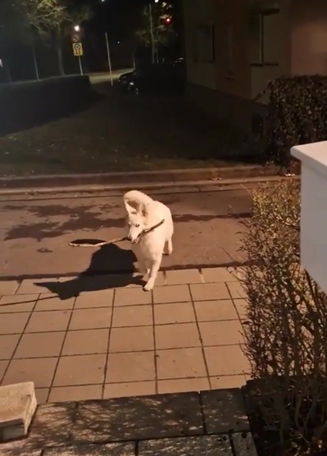 At night, a small, white dog stands on a tiled sidewalk and holds a stick in its mouth. The dog's shadow is visible on the pavement. The dog is standing near a bush and a planter. In the background, there is a street with cars, trees, and streetlights. A building is also visible in the background.